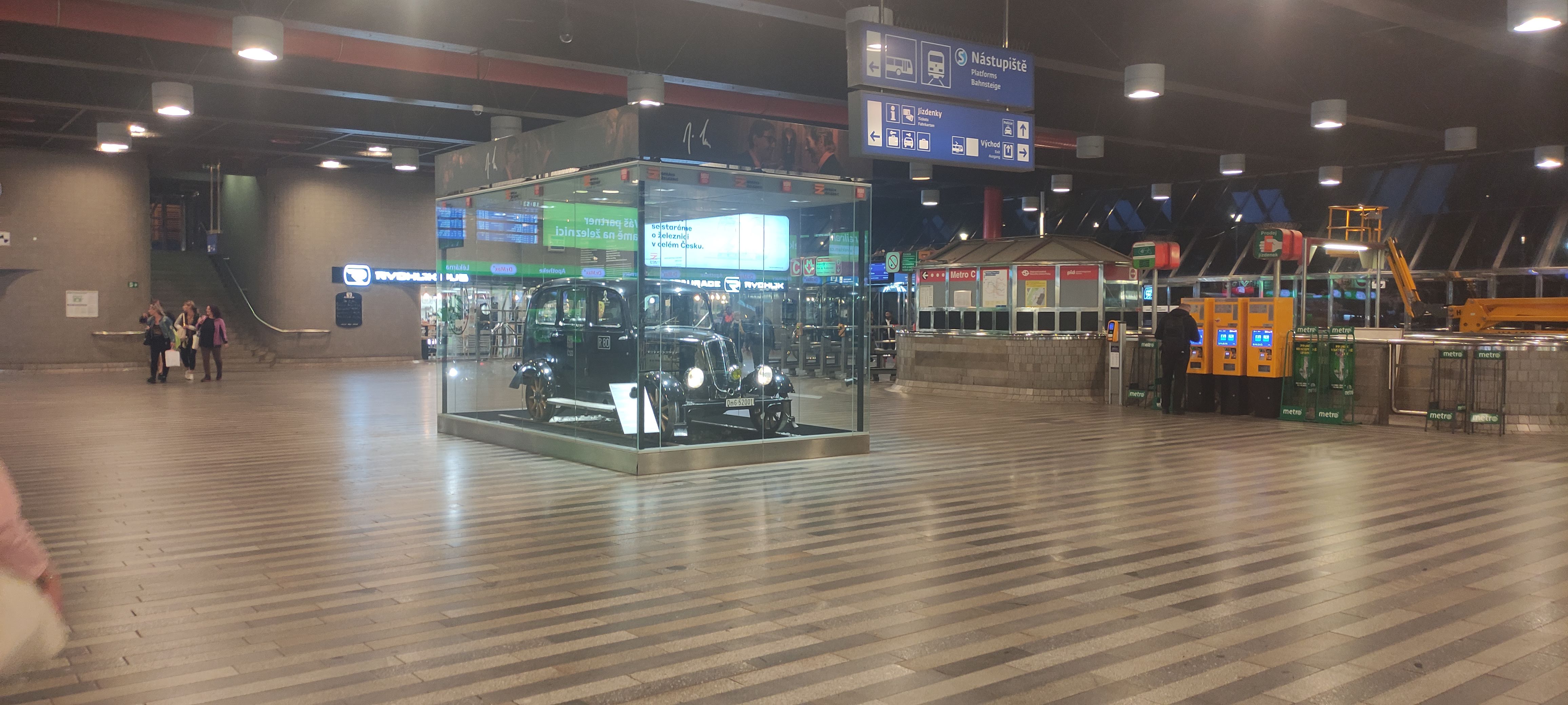 Sejdeme se na Hlavním nádraží u železniční drezíny vystavené ve velkém skleněném boxu. Nachází se hned u jednoho z východů z metra v hlavní hale, viz obrázek (můžete ho rozkliknout pro zvětšení).