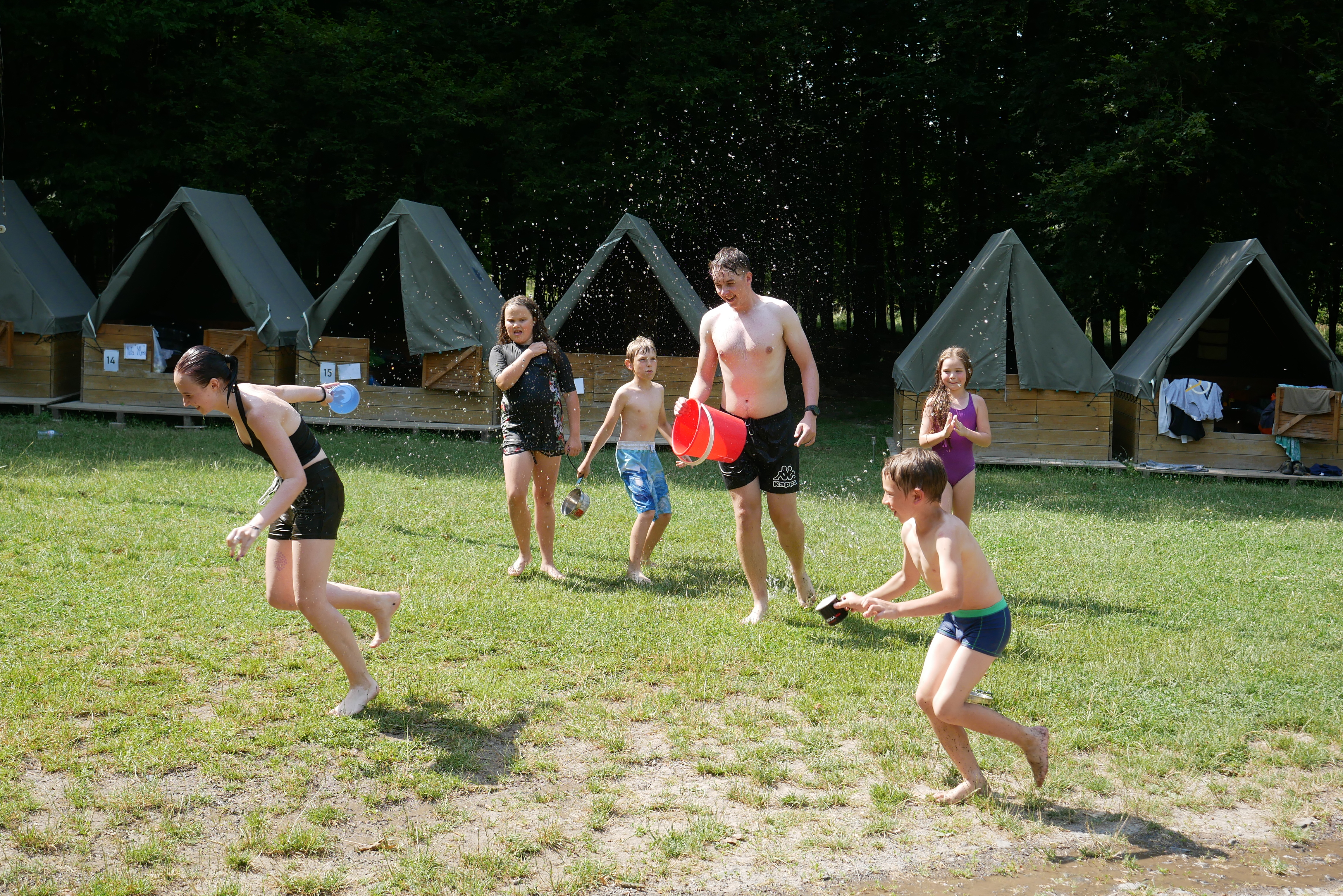 Tábor se nám ale chýlil pomalu ke konci a to znamenalo jediné - poslední bitva, která ukončí a uzavře celý příběh. Letos se však konec tábora nesl ještě v duchu čím dál vyšších teplot. Je to sice často nepříjemné, ale my jsme toho naopak zvládli využít, a tak jsme si ještě užili trochu zábavy při vodní bitvě na louce v tábořišti - zkrátka jsme popadli ešusy, hrnečky a kýble, převlékli se do plavek, a nebáli se trochu se namočit. V tom vedru jsme se všichni bezvadně osvěžili a v plné síle nakonec vyrazili na poslední utkání se zlými silami našeho příběhu, které jsme (samozřejmě - co by to bylo za konec tábora) porazili a vše dopadlo nejlépe, jak mohlo. Po bitvě následovalo už jen povídání si o dění na táboře a o tom, jak moc nám nevoní latríny nebo nás pobodali komáři (také se tomu říká reflexe)